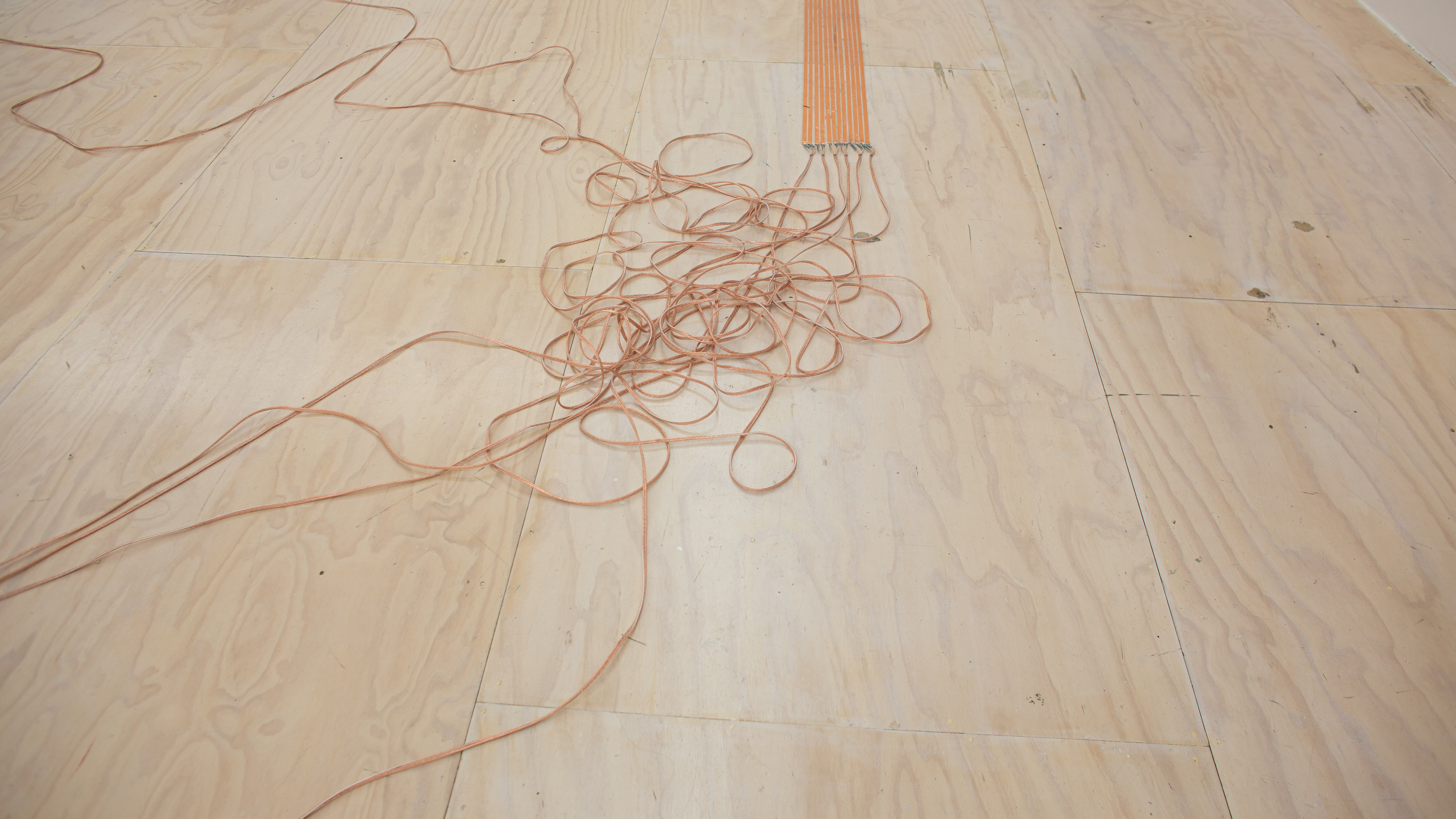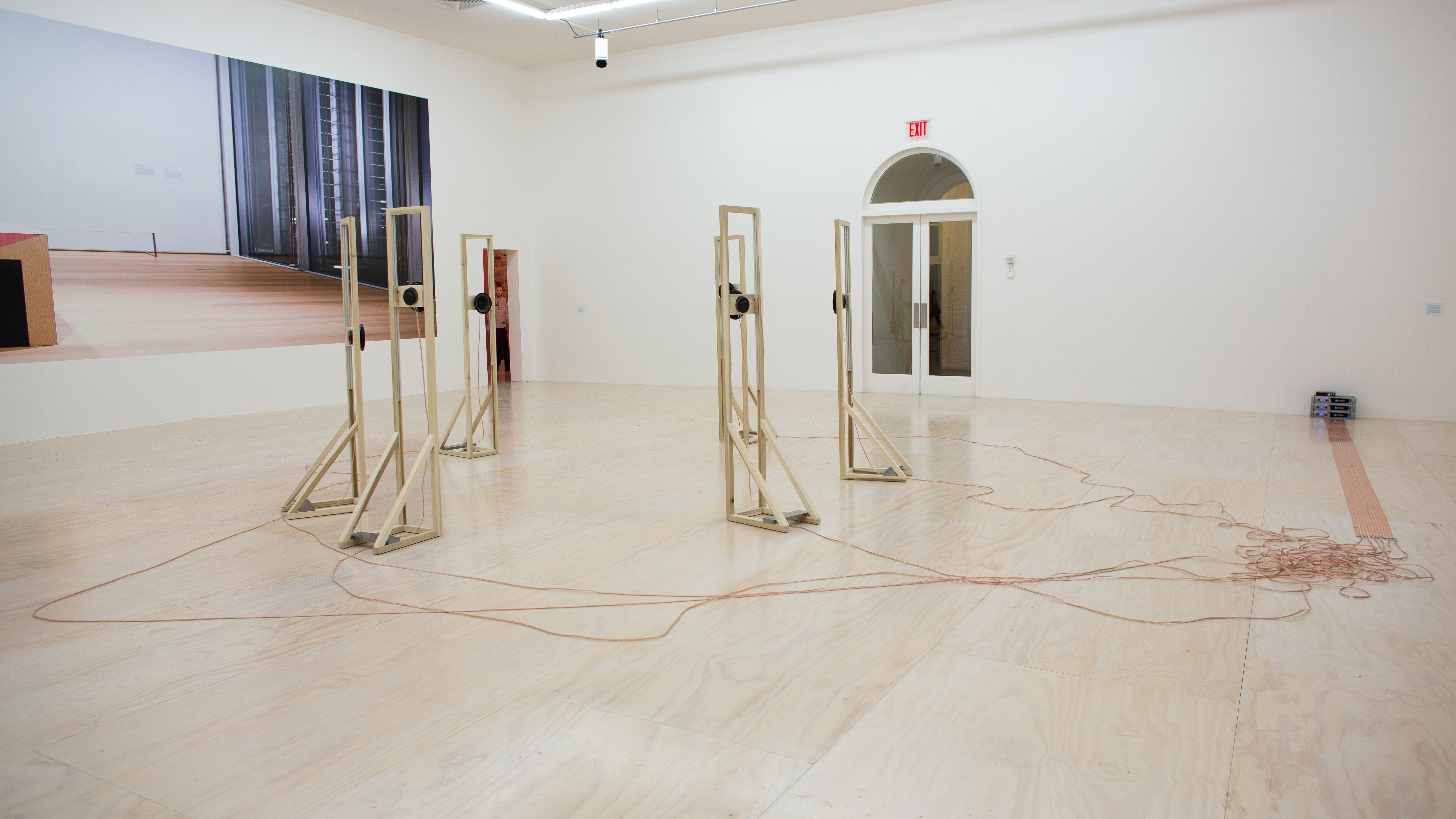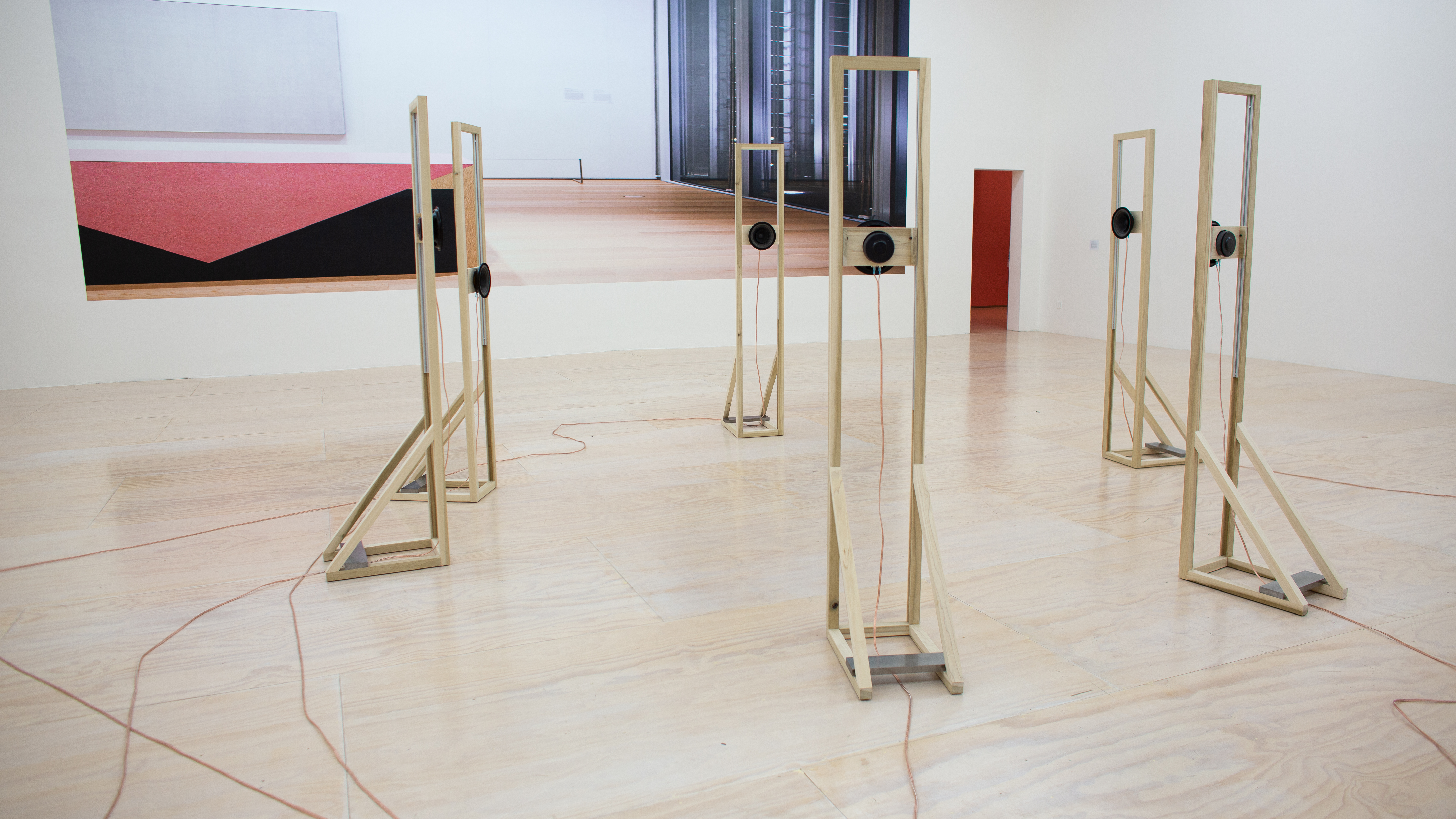 Double Mouth feedback, 2015, six-channel sound installation (12 minute loop); wood, steel, speakers, speaker wire, amps, audio interface, and participant recordings; six sculptural elements: 8 feet x 12 inches x 2 feet. Installation dimensions variable.